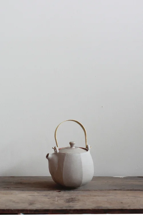 Thrown jug with brass handle. Tansparent glaze inside and matt glaze outside.